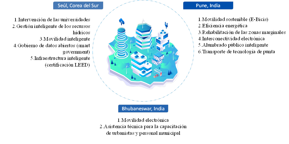 Si bien, la tecnología, la investigación y el desarrollo son los elementos que han hecho posible la innovación de estos nuevos conceptos de ciudad, la ilustración 2 muestra una clara visión de las nuevas tendencias que siguen esas ciudades del futuro, ya que como eje central están involucradas en la sostenibilidad ambiental, con diversos proyectos que van desde temas de agua, energía, edificaciones e infraestructura amigable con el ambiente y acorde a las necesidades de la ciudadanía, y como respuesta las problemáticas que enfrentan las ciudades actuales entorno estos.