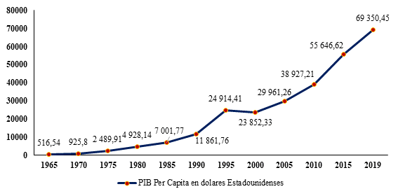 En la siguiente gráfica, se detalla la evolución de su PIB percapita desde el año 1965 al año 2019.