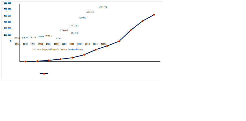 Por otra parte, en relación al Producto Interno Bruto (PIB), también tuvo una evolución incomparable en tan poco tiempo. En la siguiente grafica se detalla la evolución del PIB en Singapur desde el año 1965 al 2018: