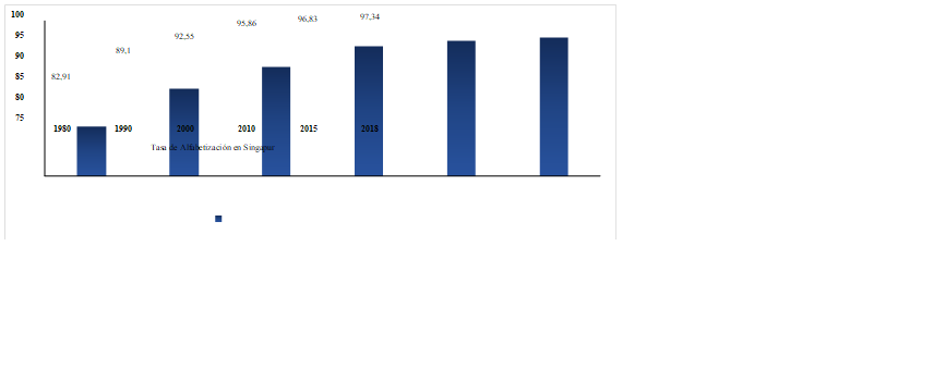 En lo concerniente a su tasa de alfabetización, Singapur conforma la lista de los países con los índices más altos en alfabetización, un reto que hoy aspiran muchos de los países en vías de desarrollo. La grafica N.5, muestra gráficamente la evolución de la tasa de alfabetización en los últimos años: