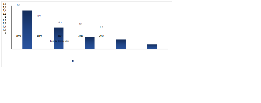 Este país en la actualidad tiene una de las tasas de homicidios más bajas del mundo donde según la Oficina de las Naciones Unidad sobre Drogas y Crimen, el país asiático, registra una tasa de 0,2 homicidios por cada 100,000 habitantes. En la siguiente gráfica se muestra la disminución de la tasa de homicidios por cada 100,000 habitantes a partir de 1990, hasta el año 2017: