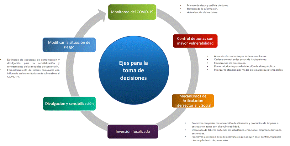 A continuación se presenta la información de forma gráfica y con las orientaciones por ejes, la cual explica que son los responsables en la emergencia los que deben realizar un monitoreo de los datos existentes para determinar las acciones para el control de las zonas con mayor vulnerabilidad y establecen mecanismos de articulación intersectorial y social para valorar los recursos y hacer una inversión focalizada eficiente y eficaz para finalmente incidir en los indicadores y modificar la situación de riesgo para volver al punto inicial de monitoreo del COVID-19.