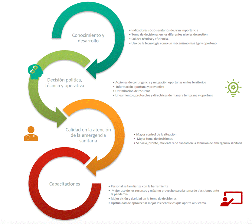 A lo largo de los 20 meses de pandemia, el proyecto ha logrado una incidencia en cuanto a la atención de la emergencia por la COVID-19 en el país, ya que permite tener a disposición de las autoridades del Ministerio de Salud, el conocimiento y desarrollo de un conjunto de herramientas e indicadores socio-sanitarios para la toma de decisiones en los diferentes niveles de gestión, de tal manera que estás puedan contar con mayor evidencia y respaldo técnico. Además, de establecer el uso de la tecnología como un mecanismo que permite más agilidad y oportunidad para obtener la información requerida.