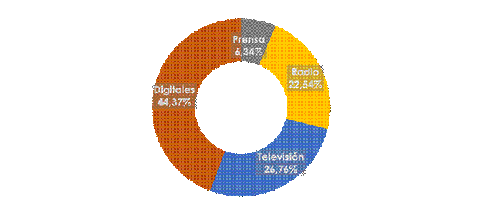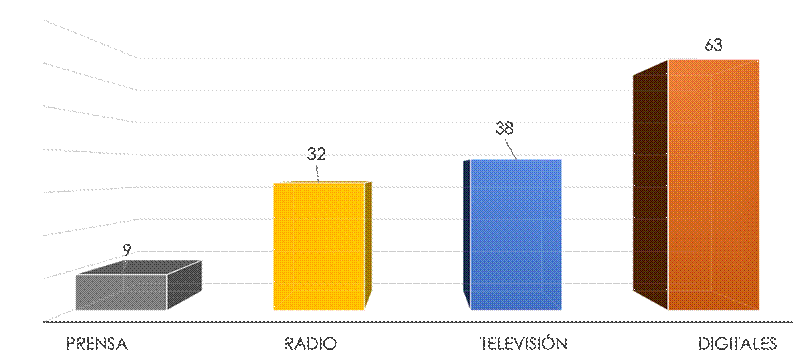En cuanto a la cantidad de noticias por tipo de medio relacionadas con el proyecto de investigación al mes de abril del año 2021 la mayor cantidad se concentraba en digitales (44%), seguido de televisión (26%) y en tercer lugar en radio (22%) (ver gráficos 2 y 3).